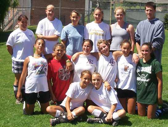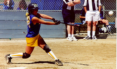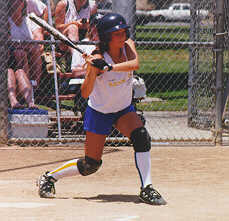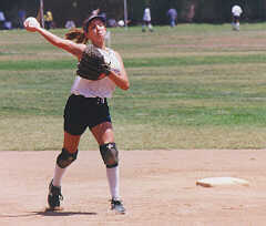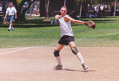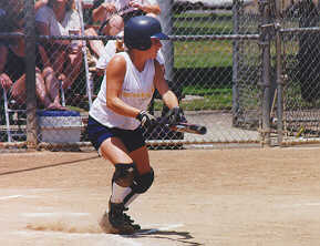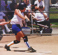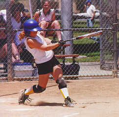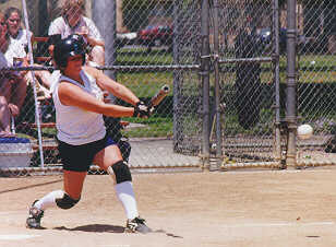 Here's Kathleen, one of our first-base players, whomping one. Kathleen also catches and has given us a few innings on the mound when needed. She bats left and throws left. (A left-handed catcher? you bet!). Kathleen attends Bishop Montgomery HS. |