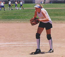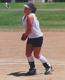 first base. Here she's giving a batter the "stork stare." Jessica throws